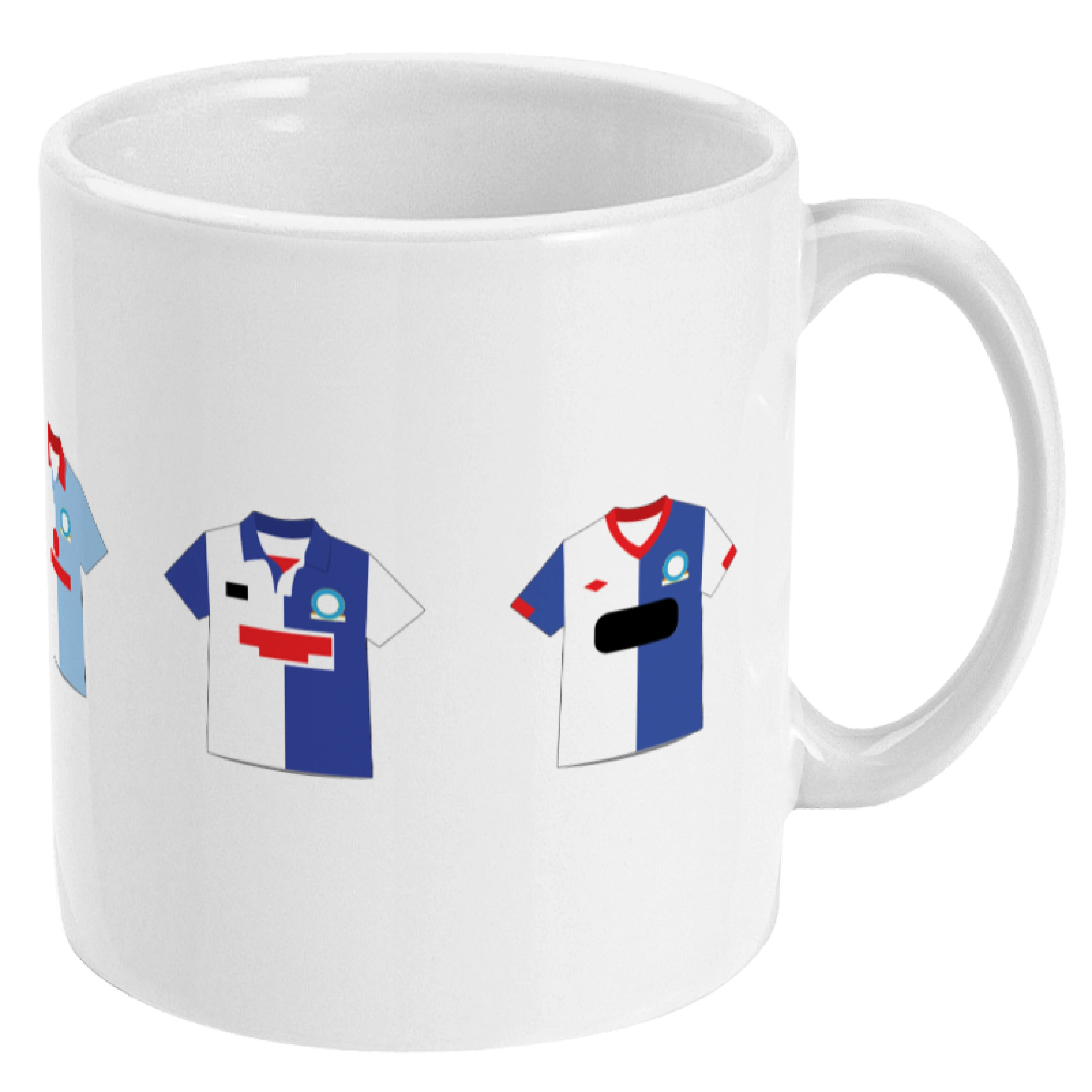 This mug features five famous shirts of Blackburn Rovers.