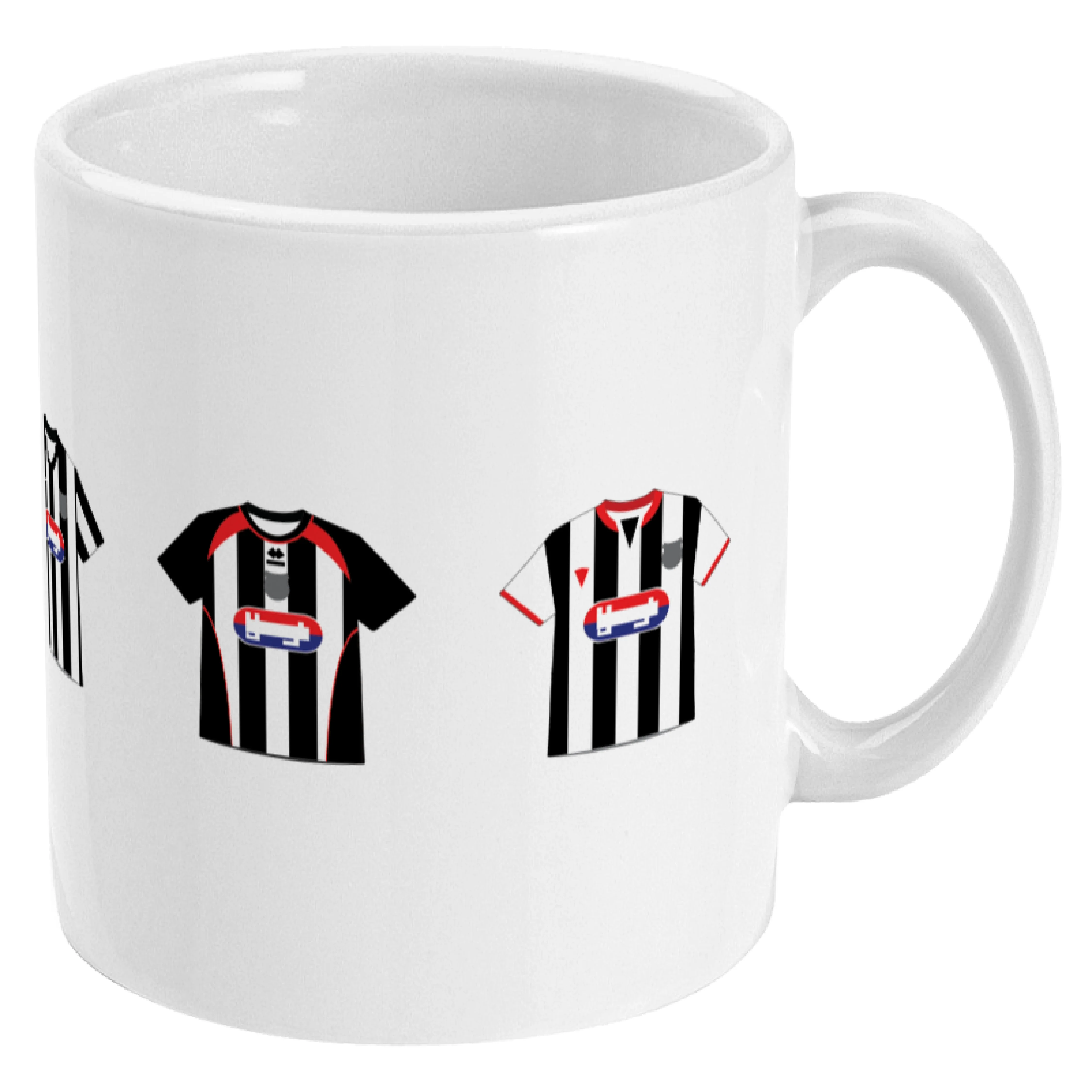 This mug features five famous shirts of Grimsby Town.