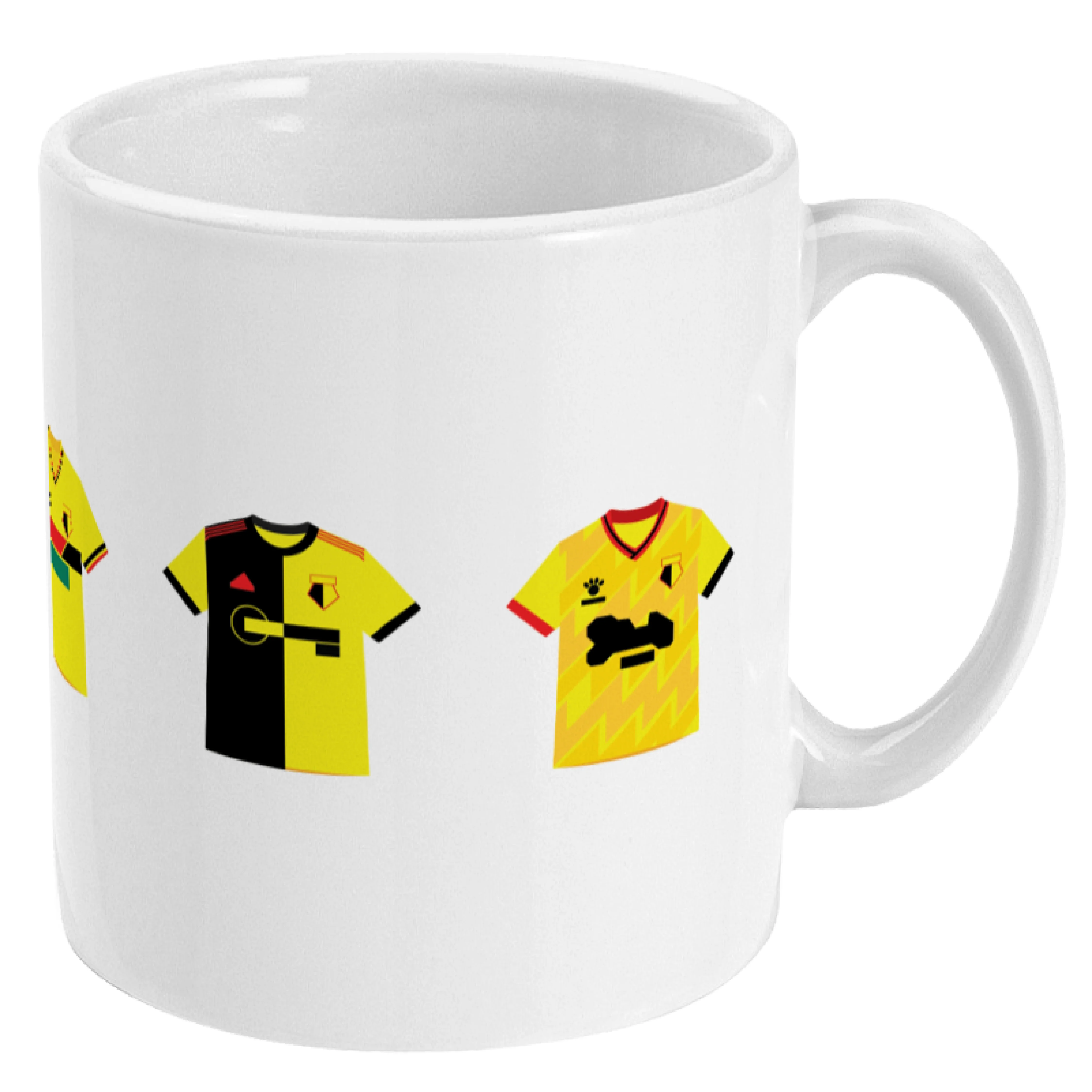 This mug features five famous shirts of Watford.